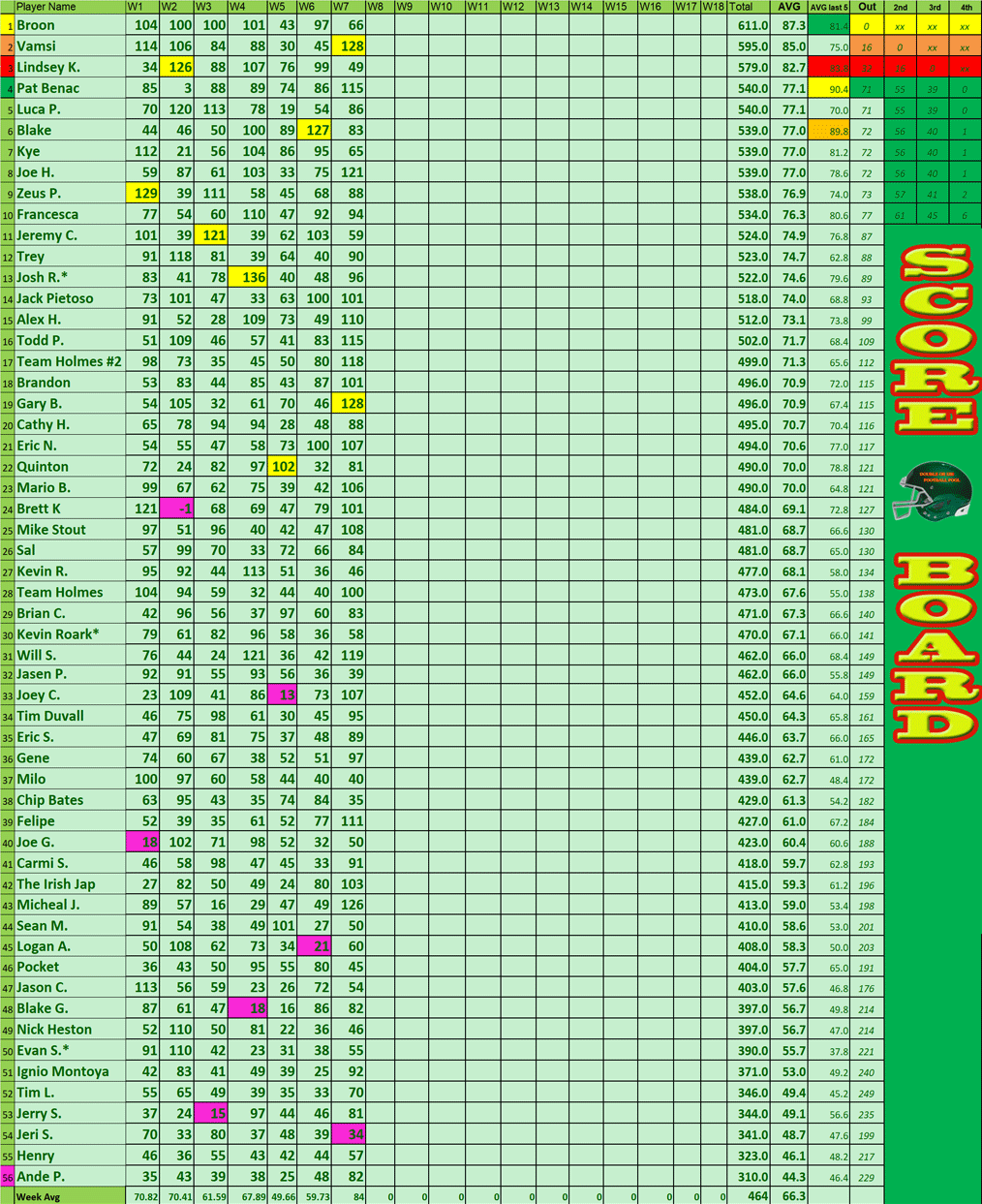 When the Bye weeks start, always drop the lowest numbers and rank (16 to 1 becomes 16-3)